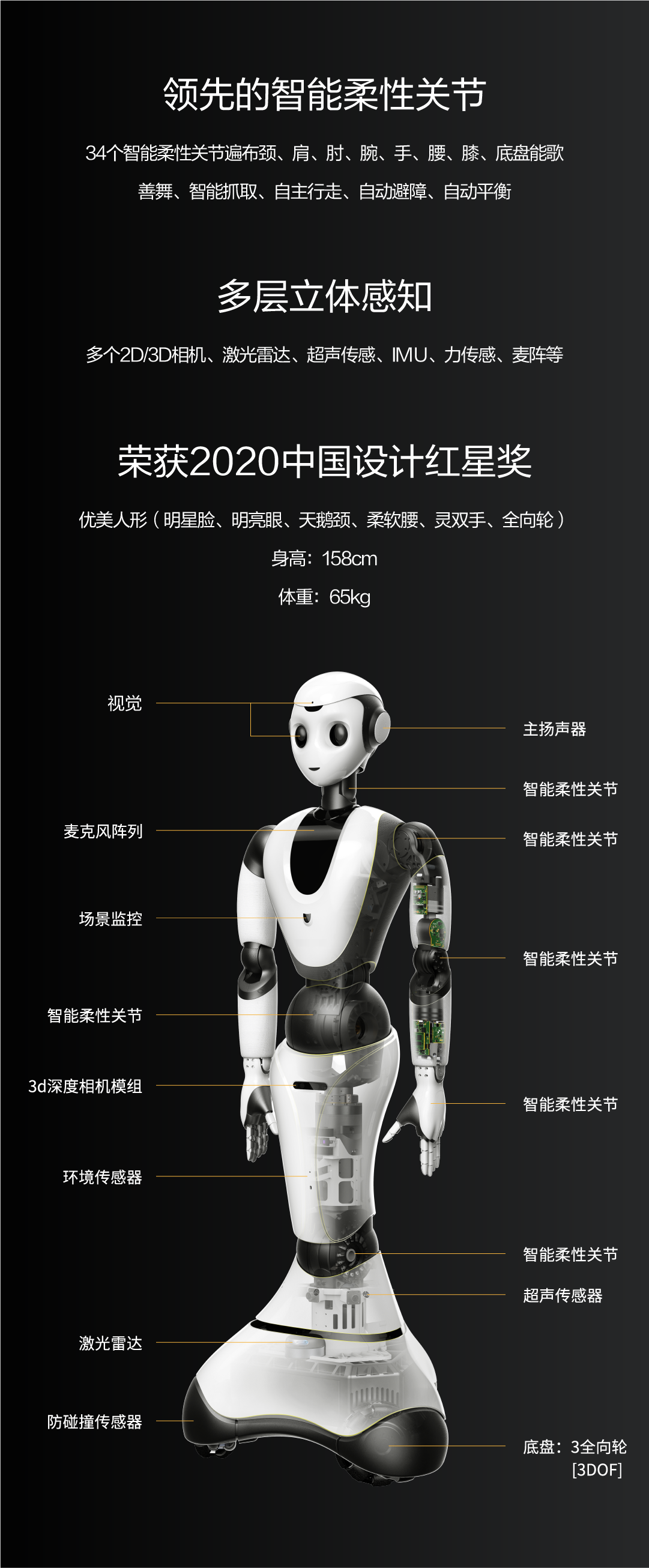 34个智能柔性关节遍布颈、肩、肘、腕、手、腰、膝、底盘